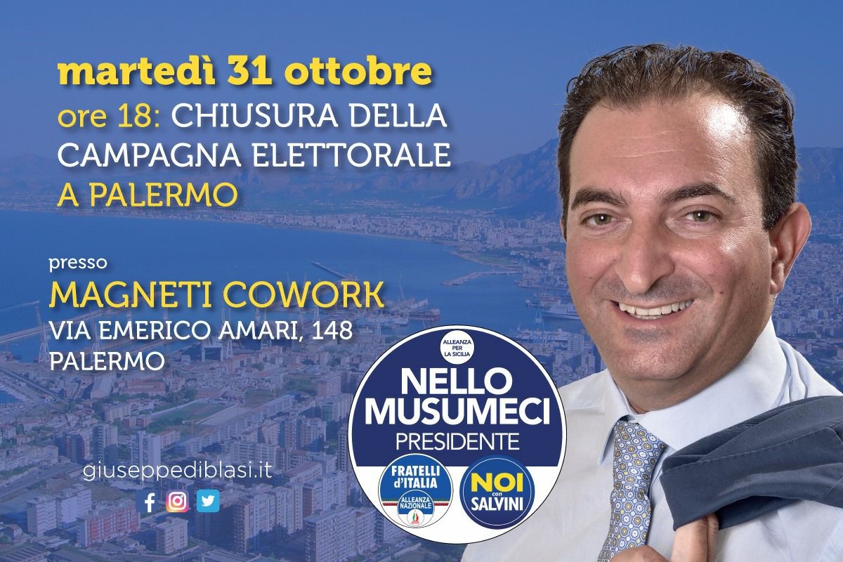 Martedì 31 ottobre alle ore 18, chiuderò la mia campagna elettorale a Palermo, presso il locale Magneti Cowork di via Emerico Amari, 148. Vi aspetto.